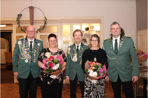ehem. Schießmeister Karl Meyer, ehem. Präsident Christian Meyer, Kassenwart Manfred Lüers, Königin Jutta Seeger,
